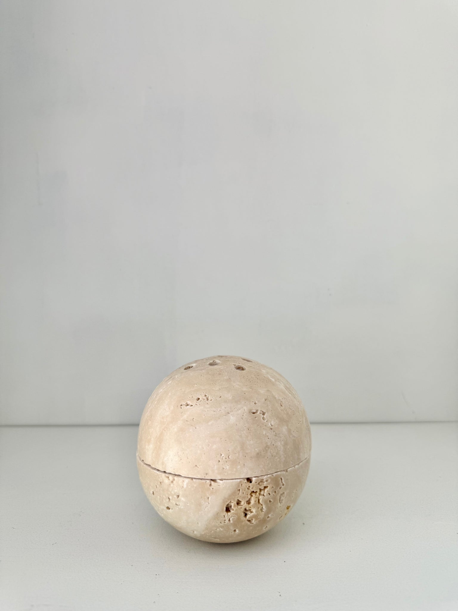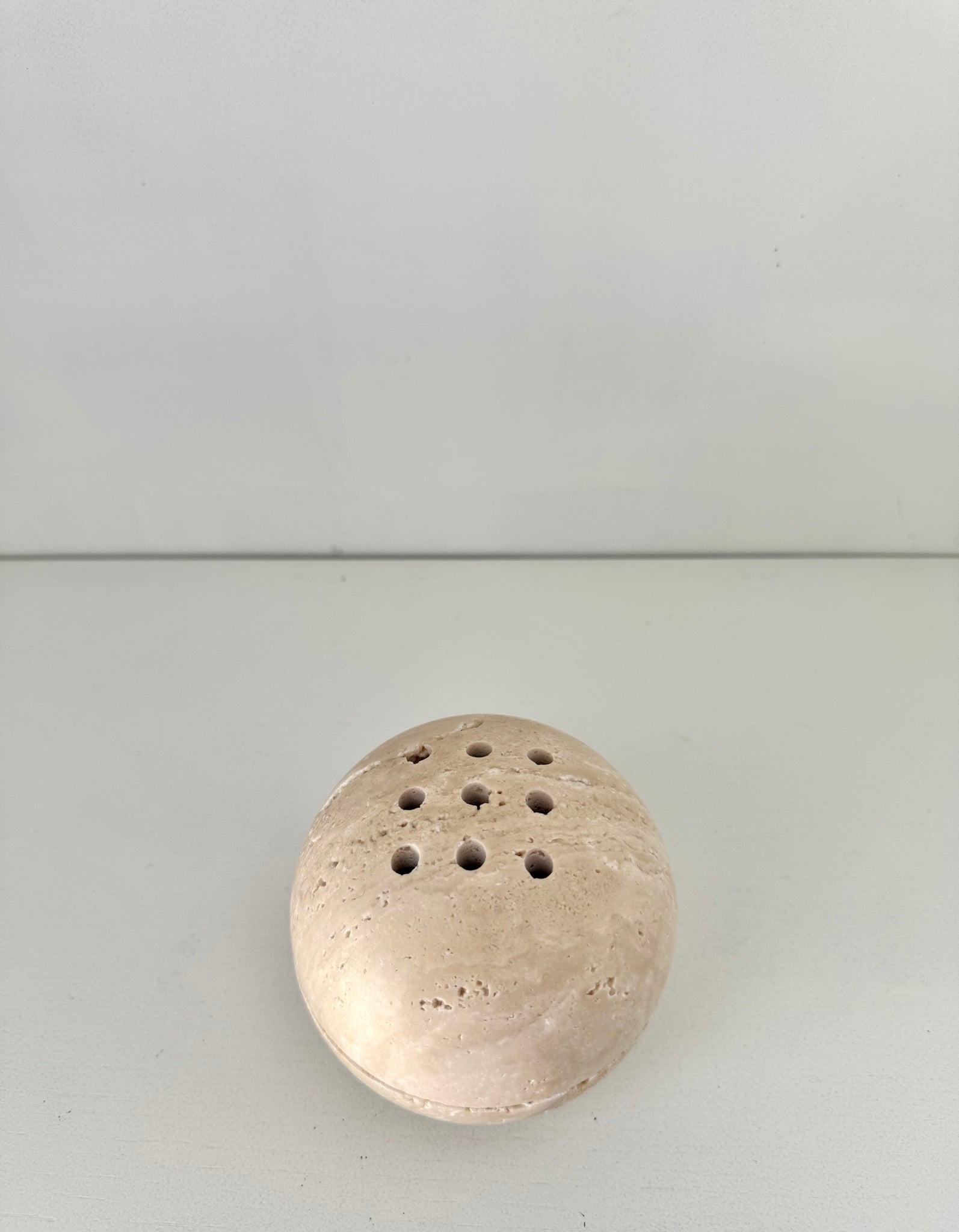 Sphere incense holder made of natural stone. Use with incense cones or burn loose sage and let the smoke filter through the holes making this a beautiful decor piece.