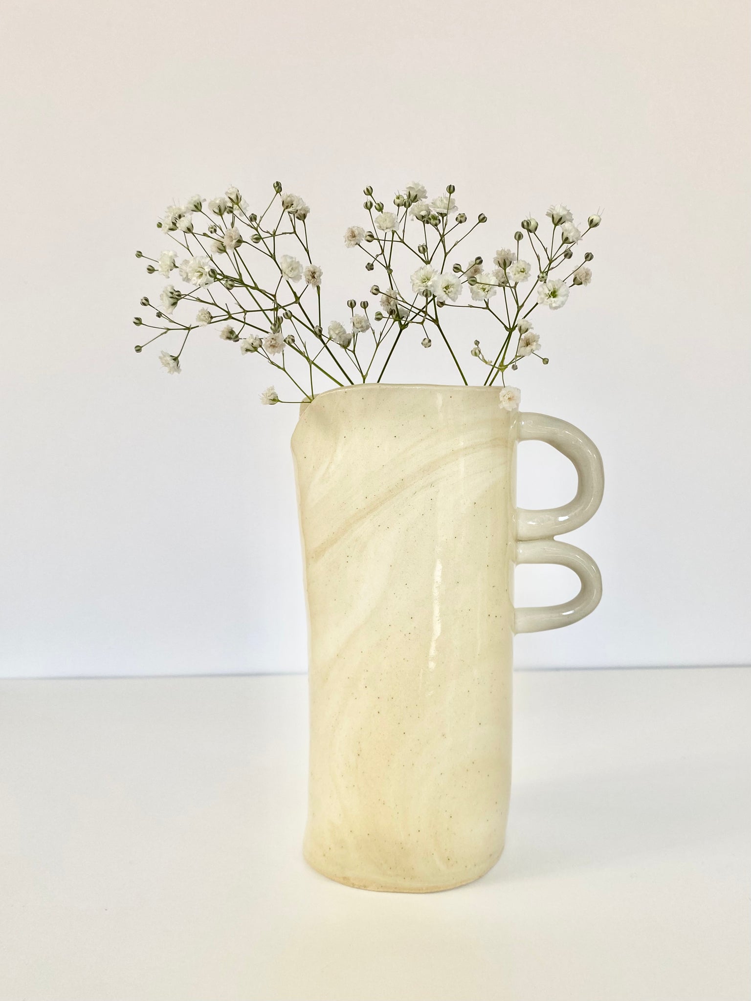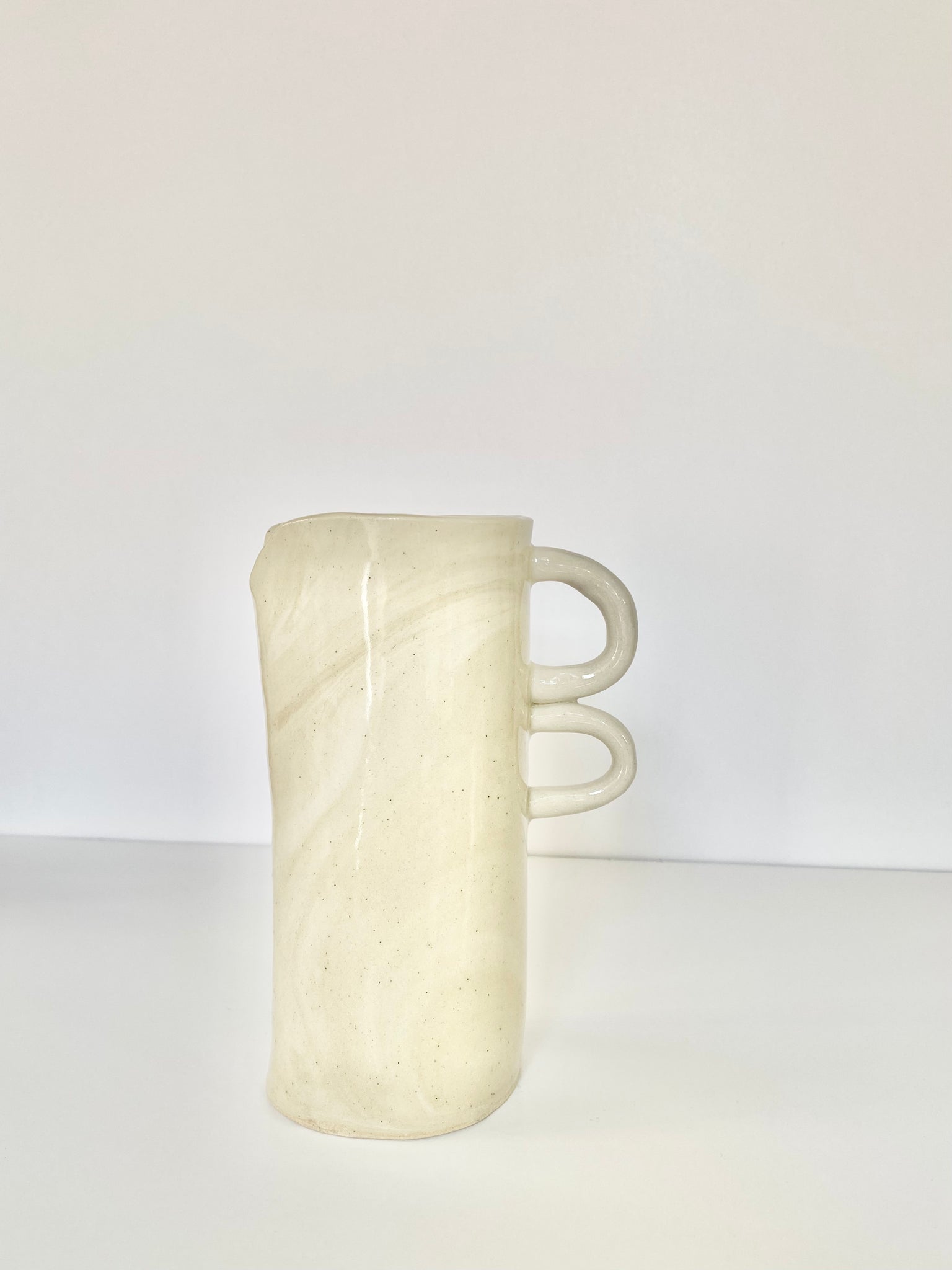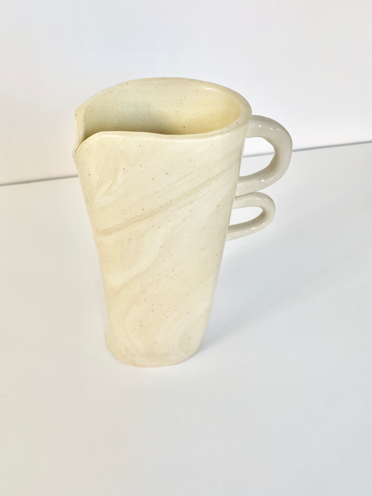 A one of a kind pottery pitcher with a subtle marble pattern throughout. The pitcher is sealed so it could be used as a vase for flowers or display your favourite dried branches.