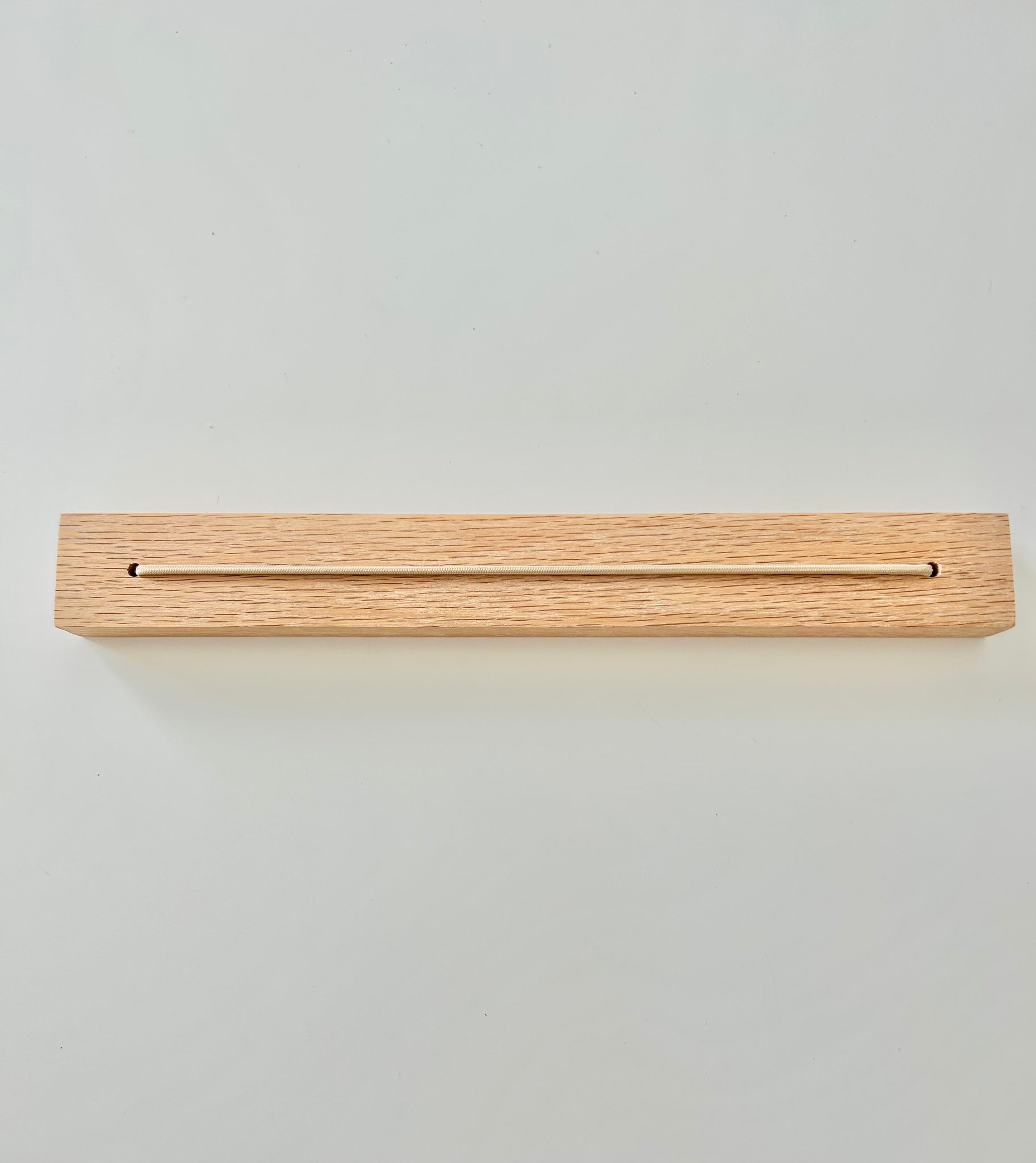 A simple, modern way to display your sunglasses. Created from solid oak and beige elastic cord then sealed with white wood oil. Holds up to 5 pairs of glasses.